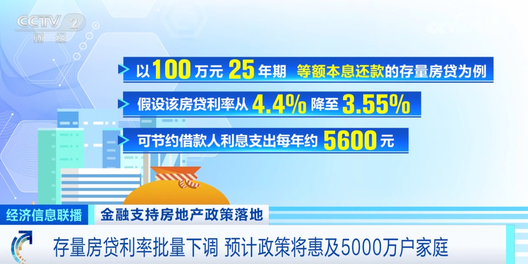 以100万元、25年期、等额本息还款的存量房贷为例,假设该房贷利率从4.4%降至3.55%,可节约借款人利息支出每年约5600元。批量调整完成后,预计这一项政策将惠及5000万户家庭。不过,这只是一个估算的平均数。因为每个借款人的房贷是在不同地区、不同时期发放的,降幅也有所不同。特别是北京、上海、深圳的借款人,调降幅度将受制于当地新发放房贷利率政策下限。