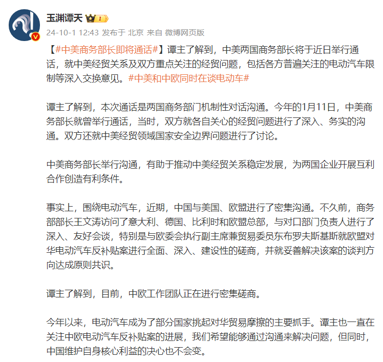 【中美商务部长即将通话】谭主了解到,中美两国商务部长将于近日举行通话,就中美经贸关系及双方重点关注的经贸问题,包括各方普遍关注的电动汽车限制等深入交换意见。#中美和中欧同时在谈电动车#