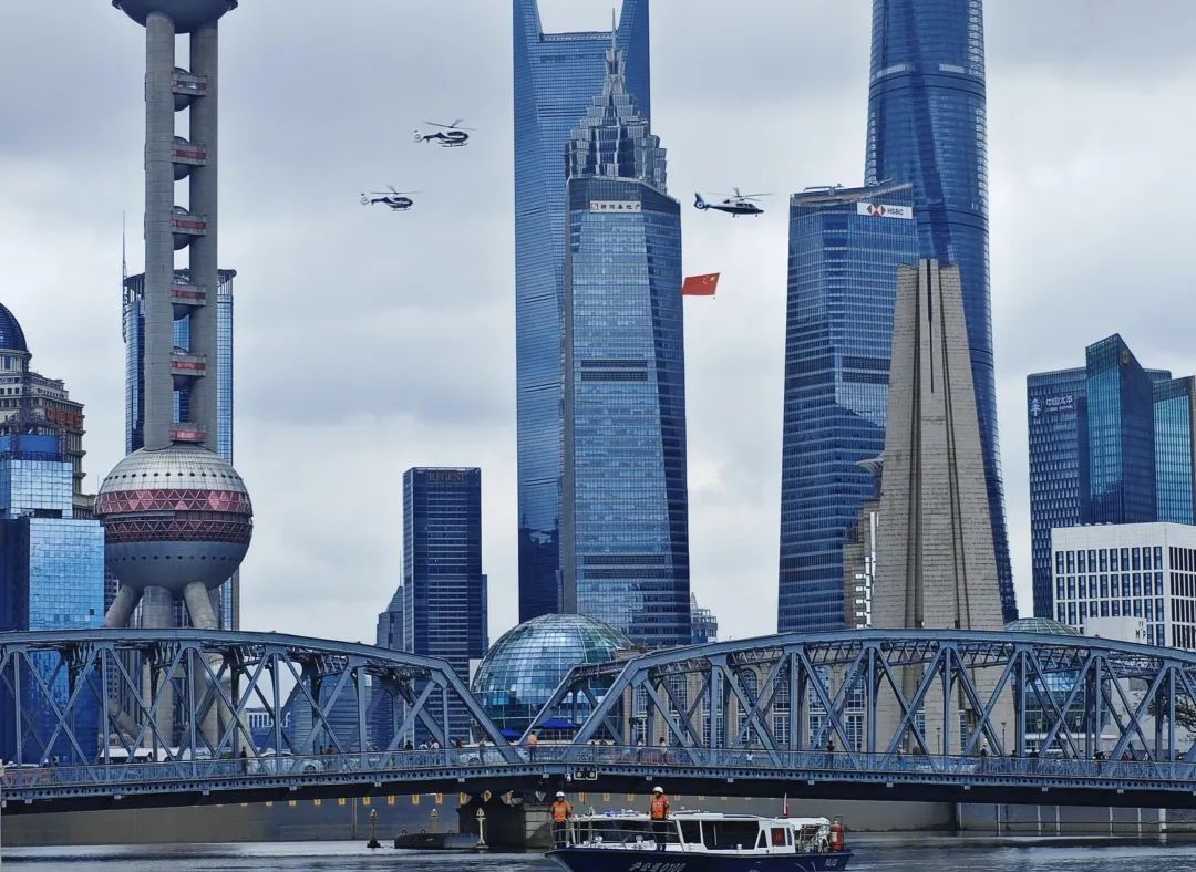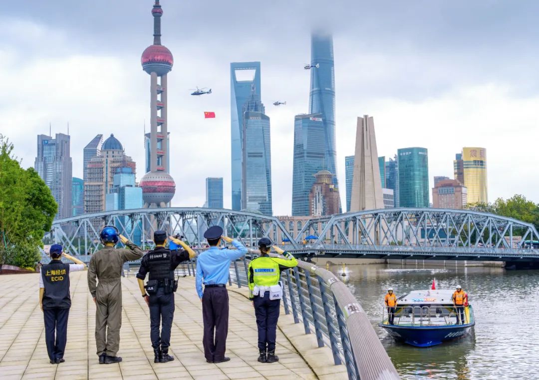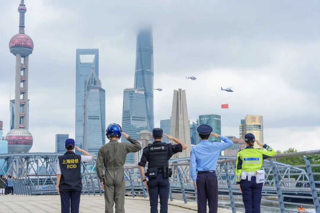 国庆节当天上午,为庆祝新中国成立75周年,上海市公安局警务航空队3架警用直升机悬挂五星红旗在黄浦江上空编队巡展飞行。领航的EC155警用直升机下方悬挂着一面6.24×4.16米的五星红旗,迎风飘扬。两架EC-135警用直升机在其后方分列左右护航,整个机队呈“品”字型。上午11点整,机队准时飞过外滩钟楼,吸引了众多市民游客挥手致意。北外滩岸边,来自各警种的五名公安代表,面对国旗,庄严敬礼,目送五星红旗从空中掠过。市民游客纷纷举起相机和手机,记录下这激动人心的时刻。