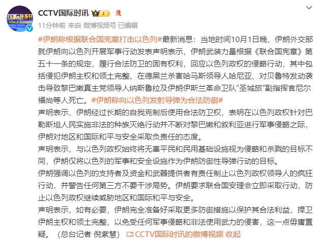 当地时间10月1日晚,伊朗外交部就伊朗向以色列开展军事行动发表声明表示,伊朗武装力量根据《联合国宪章》第五十一条的规定,履行合法防卫的固有权利,回应以色列政权的侵略行动,其中包括侵犯伊朗主权和领土完整、在德黑兰杀害哈马斯领导人哈尼亚、对贝鲁特发动袭击导致黎巴嫩真主党领导人纳斯鲁拉及伊朗伊斯兰革命卫队“圣城旅”副指挥官尼尔福尚等人死亡。
