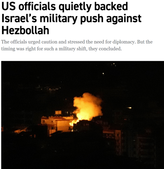 报道称,美国和以色列官员透露,尽管拜登政府最近几周公开敦促以色列减少打击,但白宫高级官员私下告诉以色列,美国将支持其加大对黎巴嫩真主党军事压力的决定。