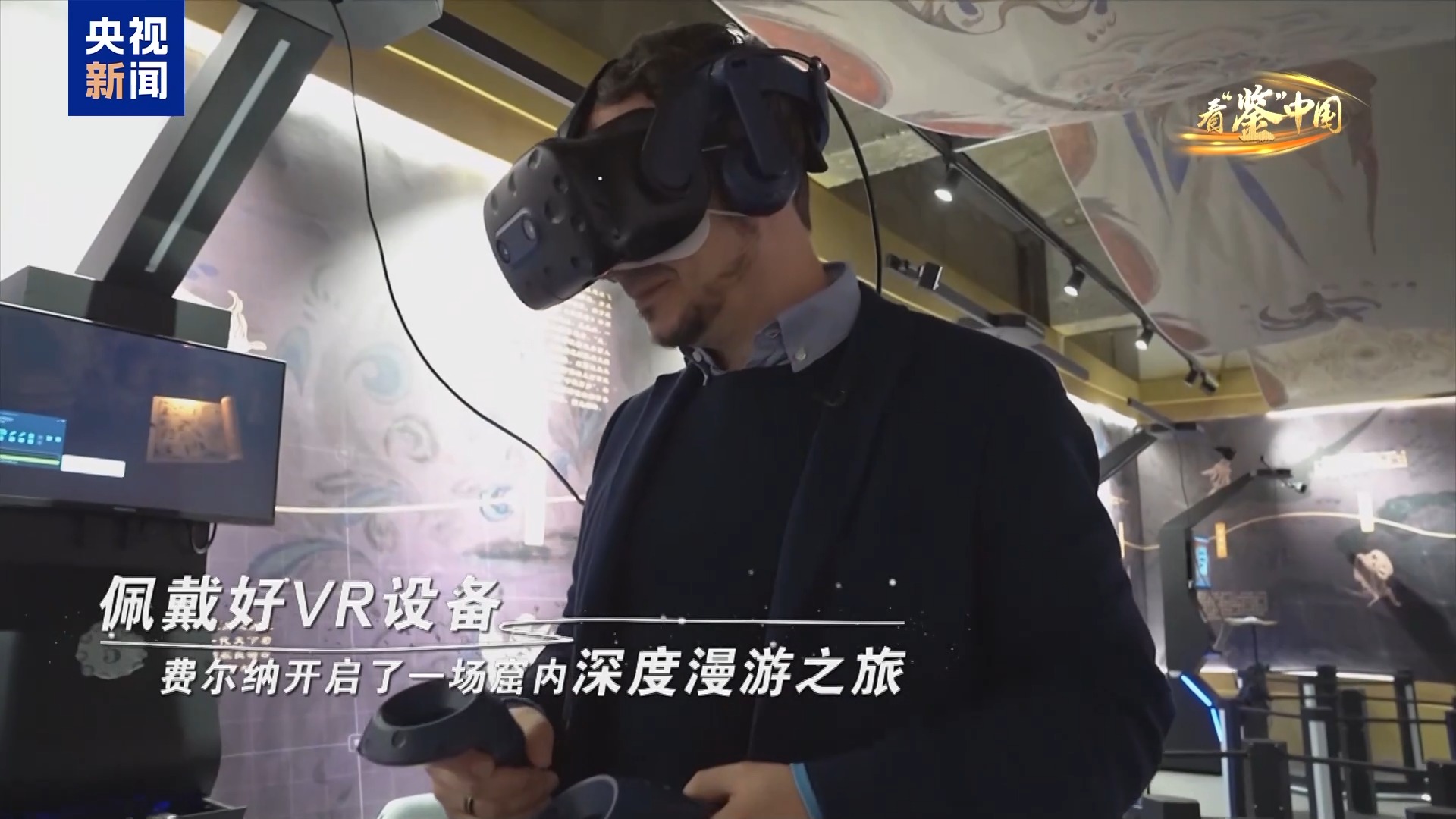 佩戴好VR设备,费尔纳开启了一场窟内深度漫游之旅,“飞”起来自由探索洞窟的每个角落、与“活起来”的壁画人物、乐器互动。