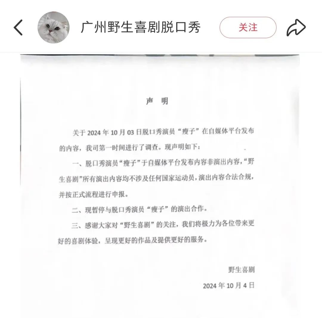 对此,“瘦子”的合作演出方广州野生喜剧脱口秀剧组在社交平台上发布声明,表示“瘦子”于自媒体平台发布内容并非演出内容,并已暂停与“瘦子”的演出合作。声明全文如下: