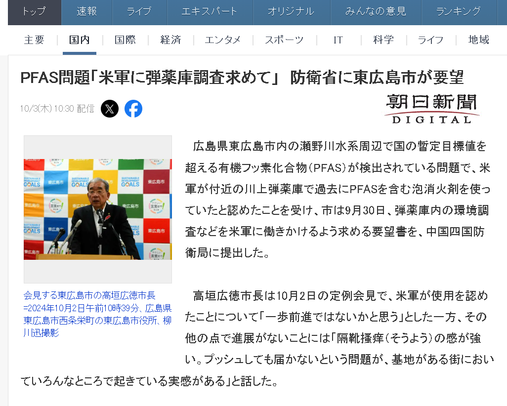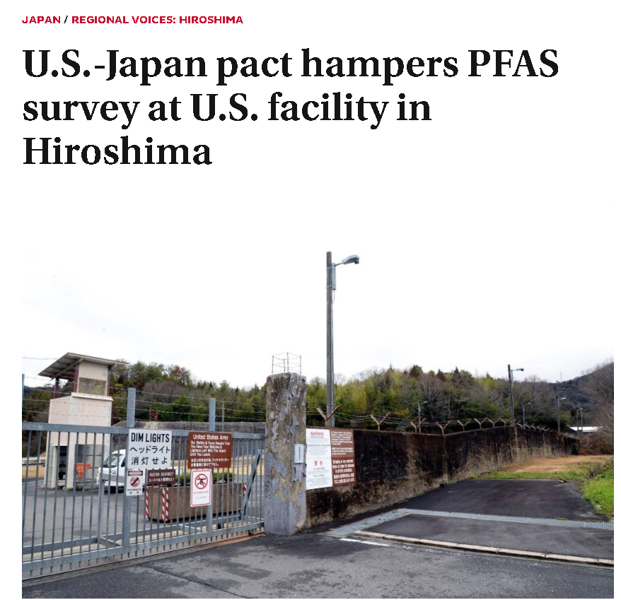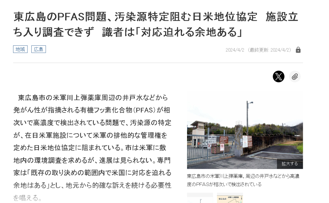 这恐怕也是为何,在面对如今东广岛市的问题时,当一些维护驻日美军的人在日本的网络上辩解说PFAS污染问题其他日本企业也有,为何只盯着驻日美军时,《朝日新闻》等日本的新闻媒体却能准确地找到《日美地位协定》这个问题的重点。