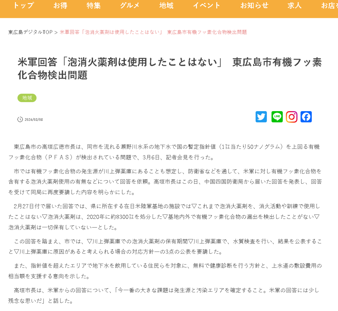 比如,在今年2月底,面对东广岛市的调查请求,驻日美军曾回应说他们“从来没有”在消防演练和训练中使用过泡沫消防剂,并称弹药库在2020年时就已经妥善处理掉了所有的泡沫消防剂,目前库里没有这种消防剂,也没有在弹药库内外检测到任何PFAS物质的泄漏。