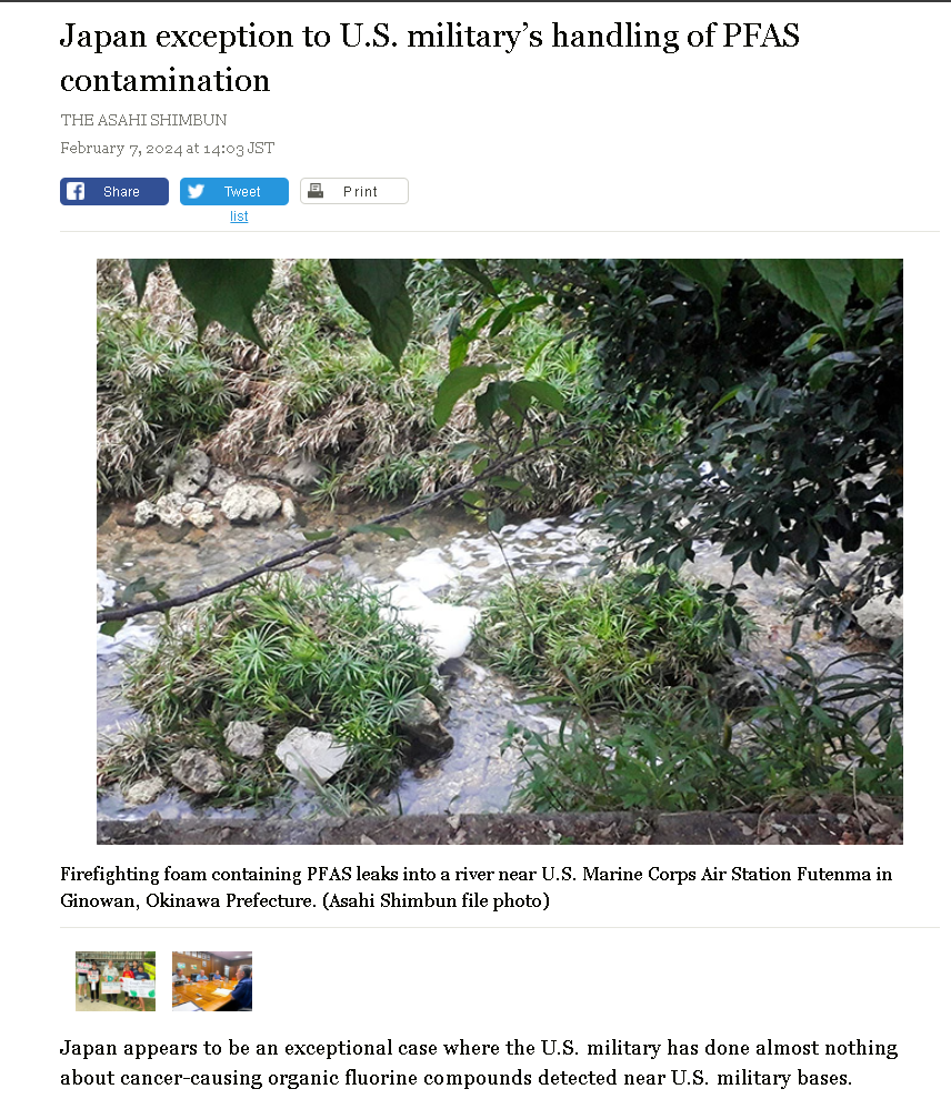 今年2月,日本《朝日新闻》就披露说,一直饱受美军基地侵扰的冲绳民众,也面临着他们的生存环境被来自美军基地的PFAS物质污染的问题——而且冲绳美军基地对当地水体的PFAS物质污染问题,是早在2016年时就出现的。