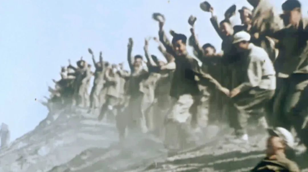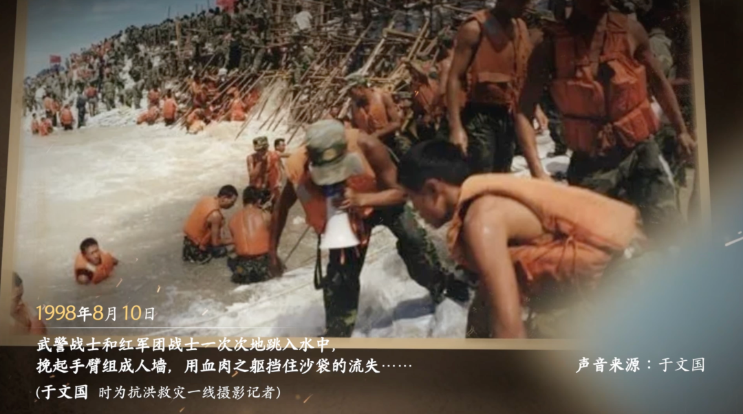 武警战士和红军团战士一次次地跳入水中挽起手臂组成人墙,用血肉之躯挡住沙袋的流失……
