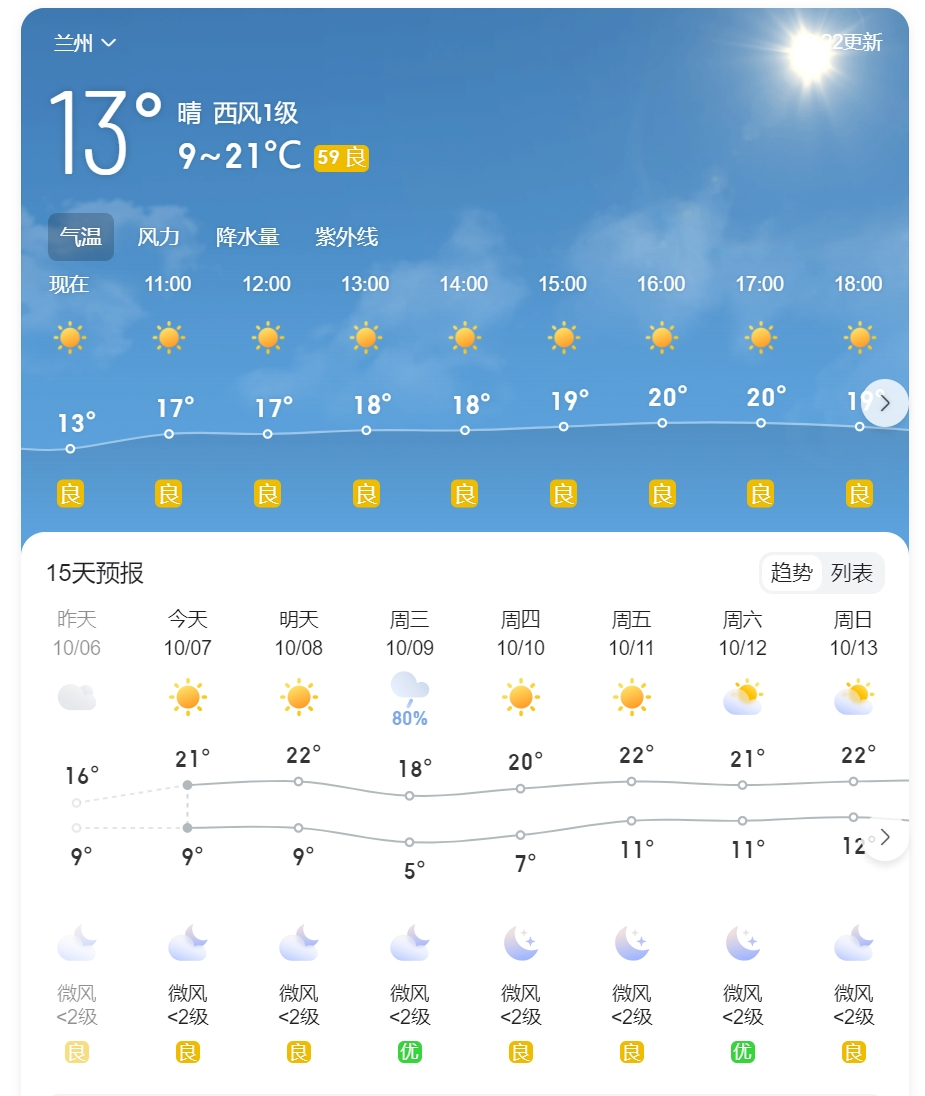 10月7日,国庆节假期最后一天,各地普遍迎来返程出行高峰,部分地区的好天气也将短暂下线。记者从甘肃省气象局获悉,10月6日夜间到10月7日白天(10月6日20时—10月7日20时),甘南、陇南、天水三州市及定西市南部多云,部分地方阴有阵雨或雨夹雪;兰州、白银、临夏、平凉等市州多云,局部地方阴有阵雨或小雨;省内其余地方晴或多云,祁连山区阴有小雨(雪)或雨夹雪。