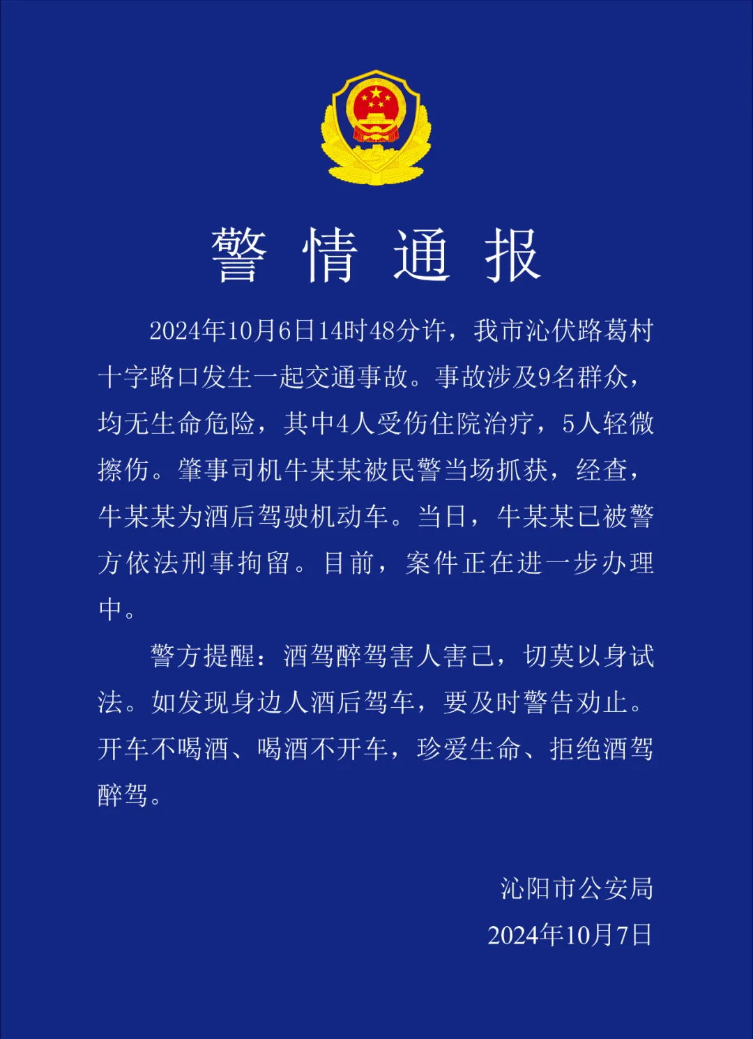 焦作沁阳警方通报一起交通事故:事故涉及9名群众,均无生命危险,肇事司机为酒驾已被刑拘