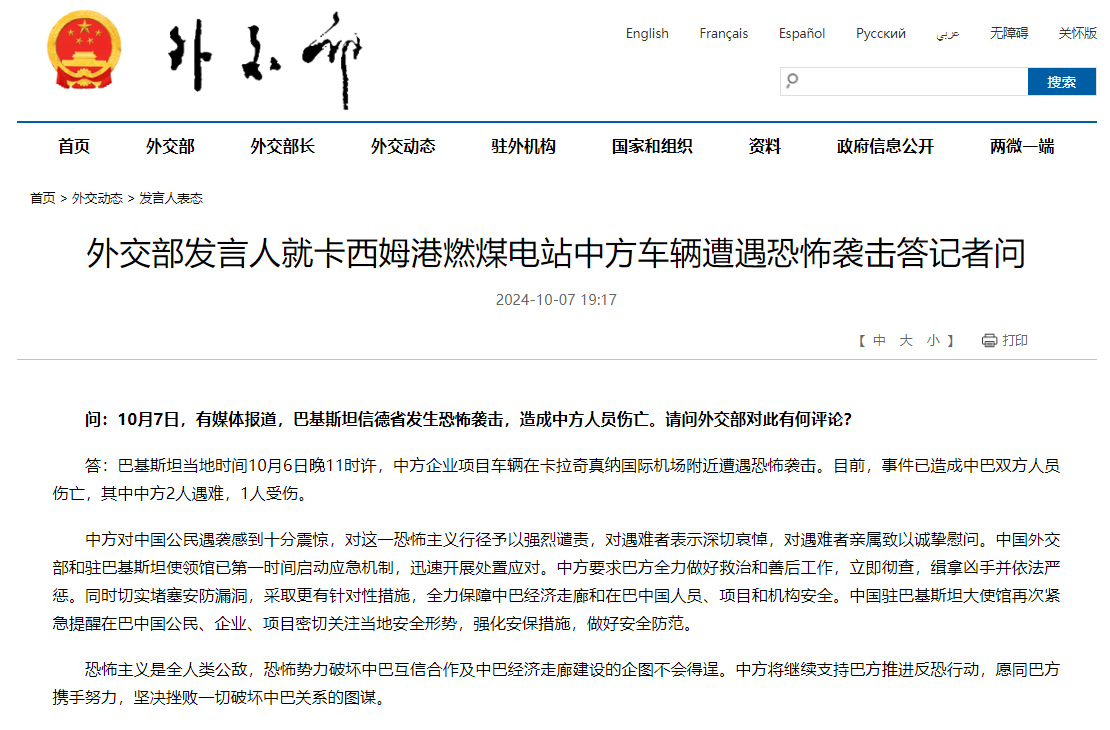 中方对中国公民遇袭感到十分震惊,对这一恐怖主义行径予以强烈谴责,对遇难者表示深切哀悼,对遇难者亲属致以诚挚慰问。中国外交部和驻巴基斯坦使领馆已第一时间启动应急机制,迅速开展处置应对。中方要求巴方全力做好救治和善后工作,立即彻查,缉拿凶手并依法严惩。同时切实堵塞安防漏洞,采取更有针对性措施,全力保障中巴经济走廊和在巴中国人员、项目和机构安全。中国驻巴基斯坦大使馆再次紧急提醒在巴中国公民、企业、项目密切关注当地安全形势,强化安保措施,做好安全防范。