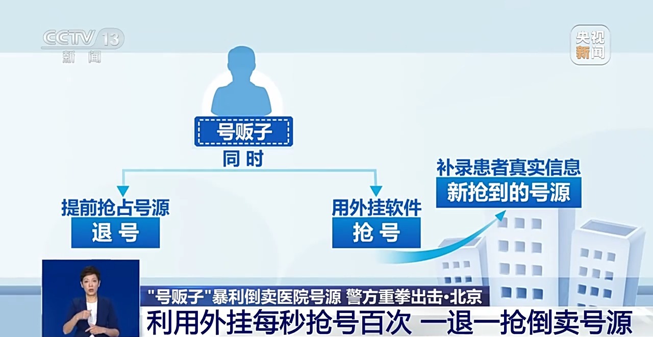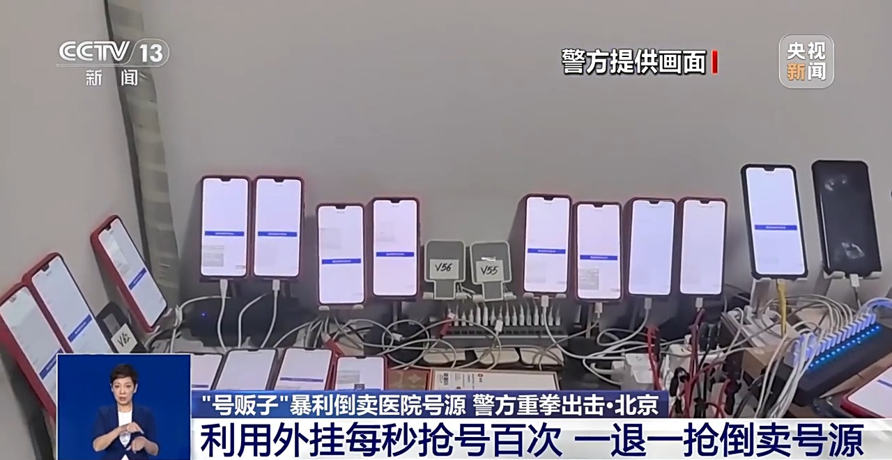 北京市公安局海淀分局治安支队副支队长 姜峰:传统的这种蹲个小马扎在那门口,靠人力来抢挂号的,现在已经不复存在了,我们抓获的外地的这些团伙,就是足不出户在家里,利用多部手机,有的甚至上百部手机同时进行抢占,抢占了号了之后也是在网上,与其他的,所有倒号的这些人员进行交易和流转。