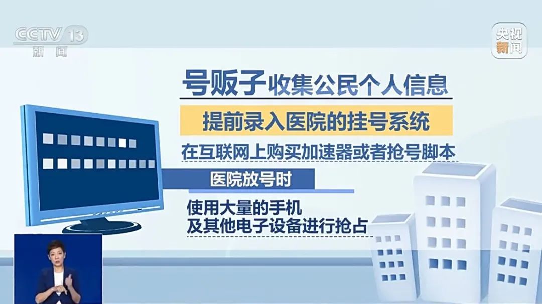 据警方介绍,“号贩子”会收集大量公民个人信息,把这些公民信息提前录入医院的挂号系统,同时在互联网上购买加速器或者抢号脚本,在医院放号时,使用大量的手机及其他电子设备进行抢占。