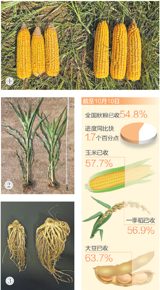 图③:未施菌剂和施用菌剂玉米(右)抽雄吐丝期的根系生长情况。
