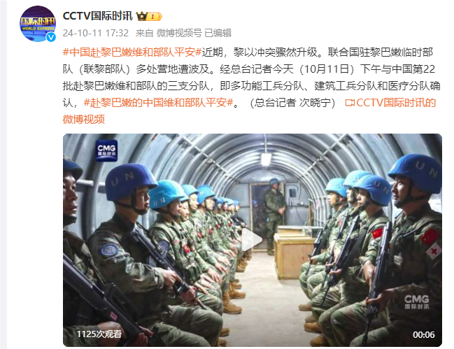 近期,黎以冲突骤然升级。联合国驻黎巴嫩临时部队(联黎部队)多处营地遭波及。经总台记者今天(10月11日)下午与中国第22批赴黎巴嫩维和部队的三支分队,即多功能工兵分队、建筑工兵分队和医疗分队确认,赴黎巴嫩的中国维和部队平安。