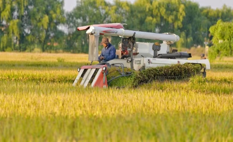 金秋时节,在江苏省海安市墩头镇禾庄村,农民正趁着晴好天气收割水稻,确保颗粒归仓,田间地头呈现出一派繁忙的丰收景象。来源:人民图片