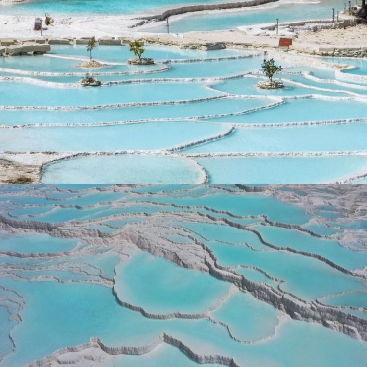 ——从自然地质看,两地都是含钙的温泉水在流动的过程中,冷却沉积下来的石灰岩层,景观十分相似;