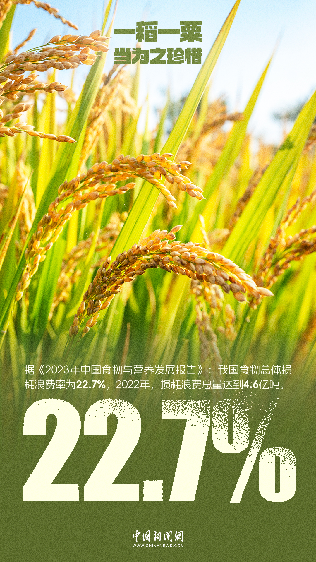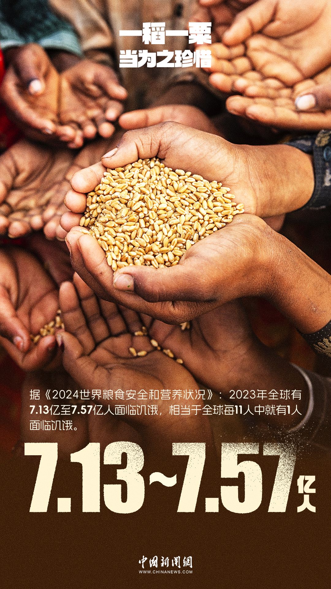 民以食为天,食以粮为先。粮食是生命的基础,节约是对未来的承诺。据《2024世界粮食安全和营养状况》:2023年全球有7.13亿至7.57亿人面临饥饿,相当于全球每11人中就有1人面临饥饿。联合国粮农组织此前估计,全球每年损失和浪费的粮食可养活12.6亿饥饿人口。2024年10月16日是第44个世界粮食日,让我们从珍惜每一粒粮食做起,杜绝浪费,用行动守护每一份来之不易的收获。