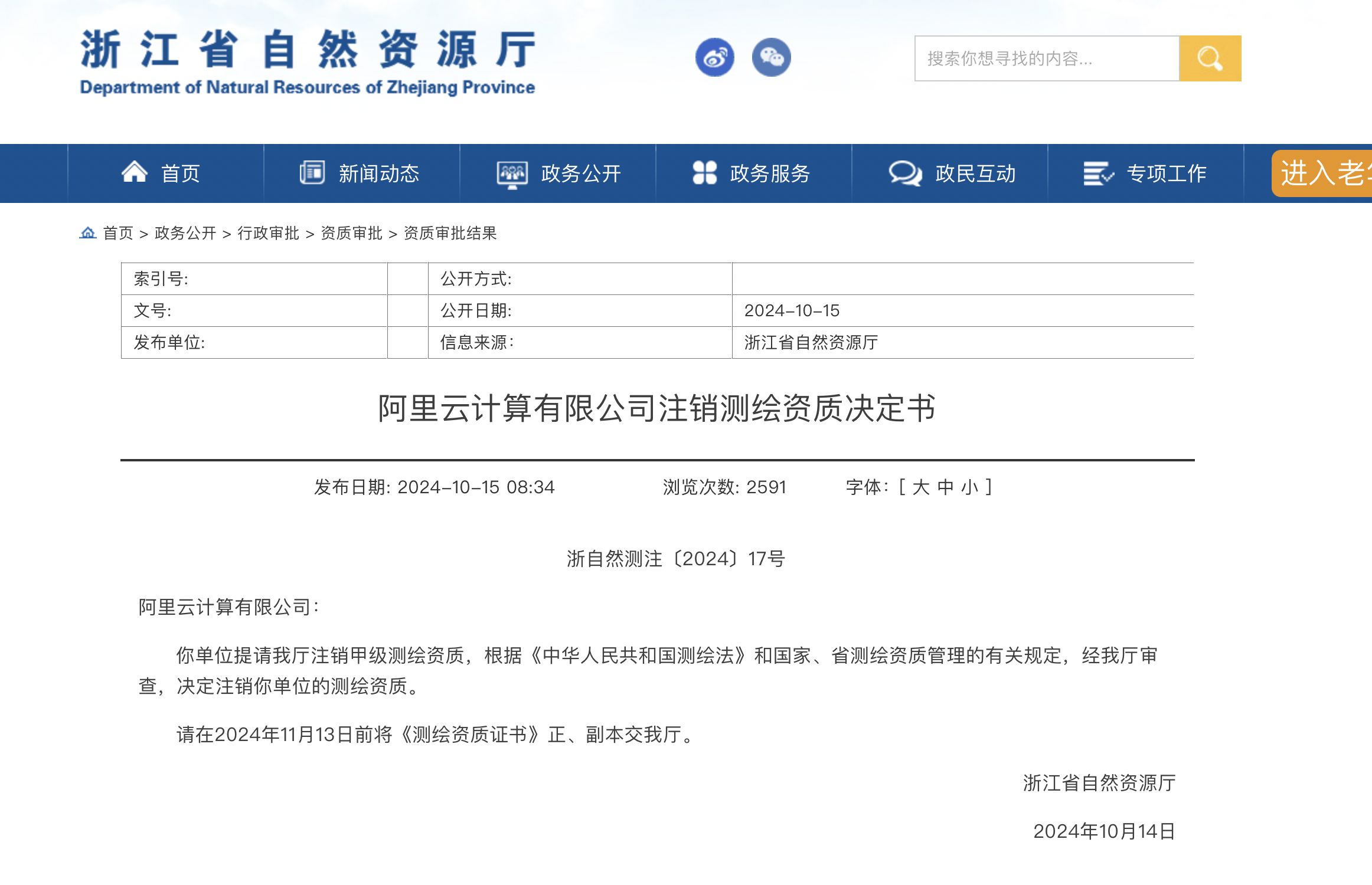 浙江省自然资源厅官网15日发布《阿里云计算有限公司注销测绘资质决定书》,注销阿里云甲级测绘资质。