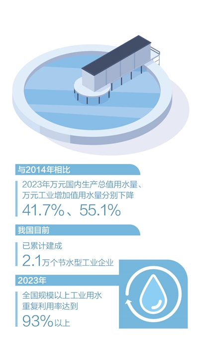 与2014年相比,2023年万元国内生产总值用水量、万元工业增加值用水量分别下降41.7%、55.1%。工业用水效率和效益不断提高,对于提升水资源节约集约利用水平至关重要。