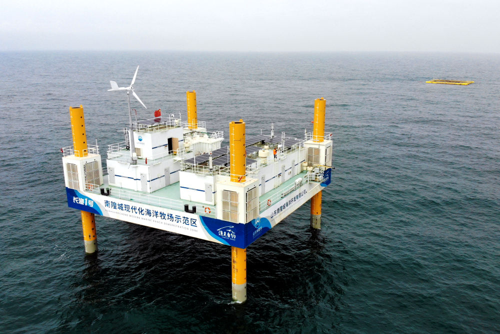 这是应用5G技术的山东长岛综合试验区南隍城国家级海洋牧场示范区海上平台(2020年8月8日摄,无人机照片)。中国(山东)自由贸易试验区设立以来,一系列大胆试、大胆闯、自主改的政策逐步落实,制度创新打通堵点、释放活力,成为深化对外开放、发展海洋经济的重要抓手。
