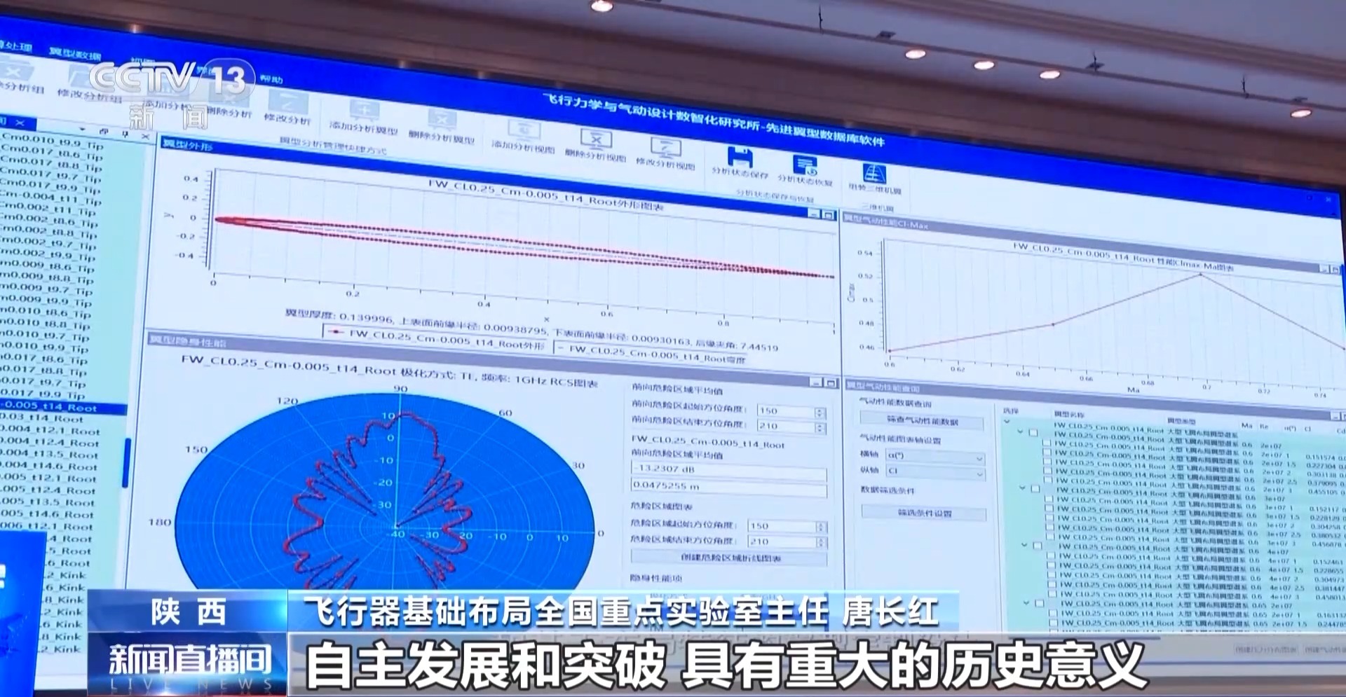 西北工业大学教授 高正红:现在发布的这一套谱系和数据库,就可以大大减少设计部门前期的一些工作,也加速了研制的过程。未来的性能要求你可以在我们的谱系里去寻找你可适应的。有更精准的要求的话,可以在我们的谱系基础上,我们配有相应的设计软件,根据你的性能要求,很快给你适应你性能要求的定制化翼型。