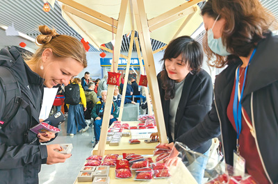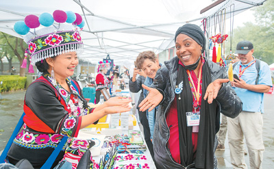 外国游客在“非遗彝绣秀北京”活动期间体验佩戴彝绣工艺品。翁奇羽摄(人民视觉)