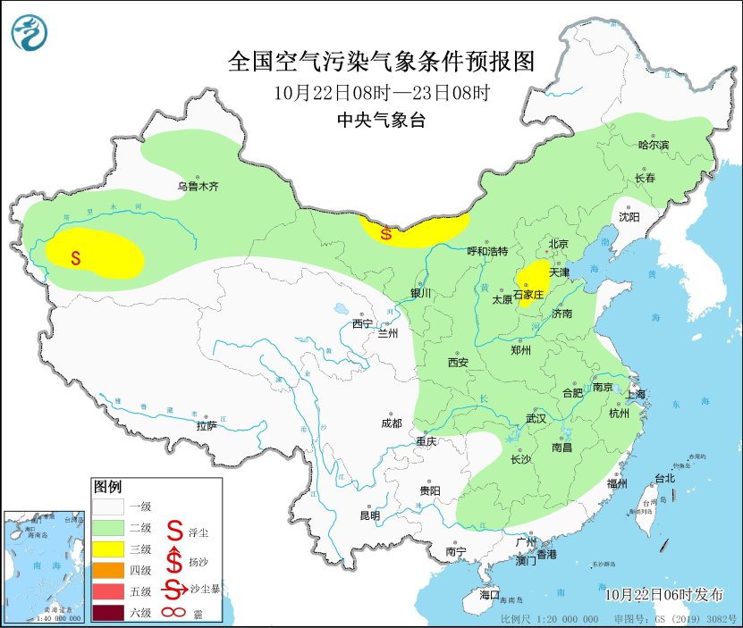 22日,全国大部地区大气扩散条件较好,无明显霾天气。23日起,华北中南部、黄淮、汾渭平原等地大气扩散条件逐渐转差,有轻至中度霾。此外,22日早晨至上午,华北南部的部分地区有大雾天气,局地有能见度不足500米的浓雾。