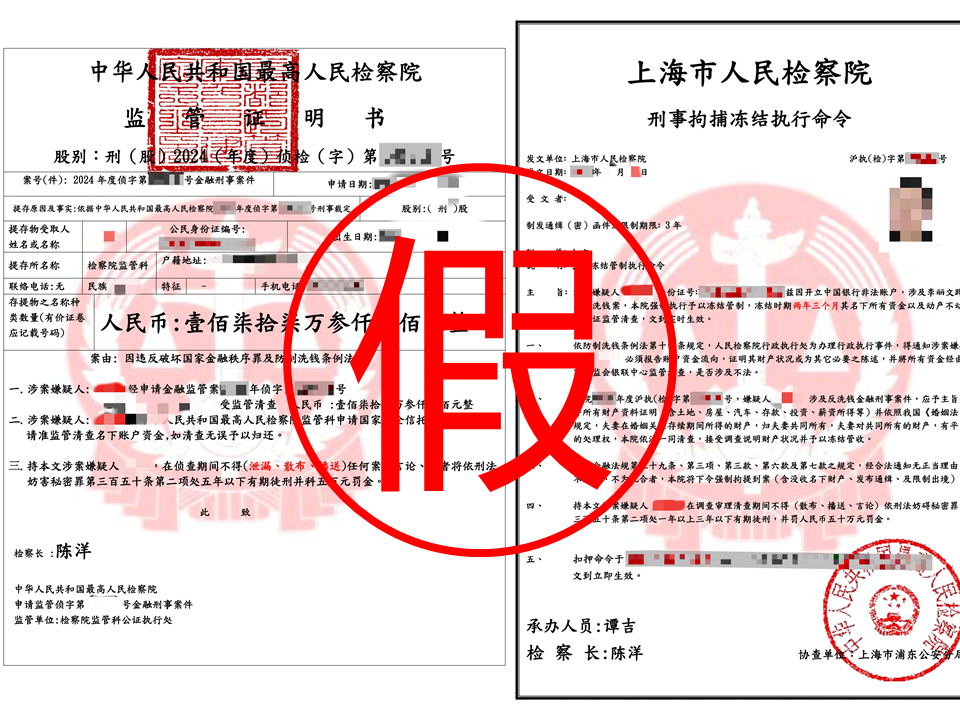 A接到自称快递公司工作人员来电,称其个人信息遭盗用,涉嫌“跨国犯罪”,并“好心”帮其转接“XX市公安局XX分局”。电话中“警官”表示,A是一桩“洗钱案”嫌疑人,需要缴纳“保证金”申请取保候审,要求其将资金转到某“安全信托账户”,并威胁如不照办就“马上通知国际刑警抓捕回国”。“警官”还声称这是“涉密案件”,要求A在此期间不得向任何人透露有关情况,并使用视频软件对A进行24小时“监视”。对方还出示了如下图所示假冒“法律文书”。