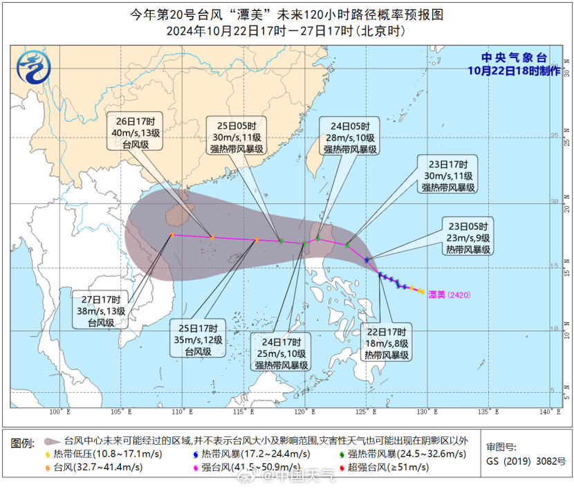 预计,“潭美”将以每小时15公里左右的速度向西北方向移动,强度逐渐增强,逐渐向菲律宾吕宋岛东北部沿海靠近,西行穿过吕宋岛北部后,于24日午后移入南海东部海面。