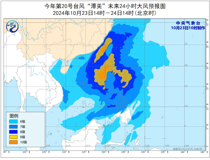 23日14时至24日14时,受冷空气和台风“潭美”的共同影响,巴士海峡、台湾以东洋面、台湾海峡、东海大部、南海北部和中部海域、北部湾、浙江沿海、福建沿海、广东沿海、海南岛沿海、台湾岛沿海将有6至8级、阵风9至10级的大风。其中,福建沿海、台湾岛西部沿海、台湾海峡、台湾以东洋面、巴士海峡、南海东部的部分海域风力可达9至10级、阵风11至12级。