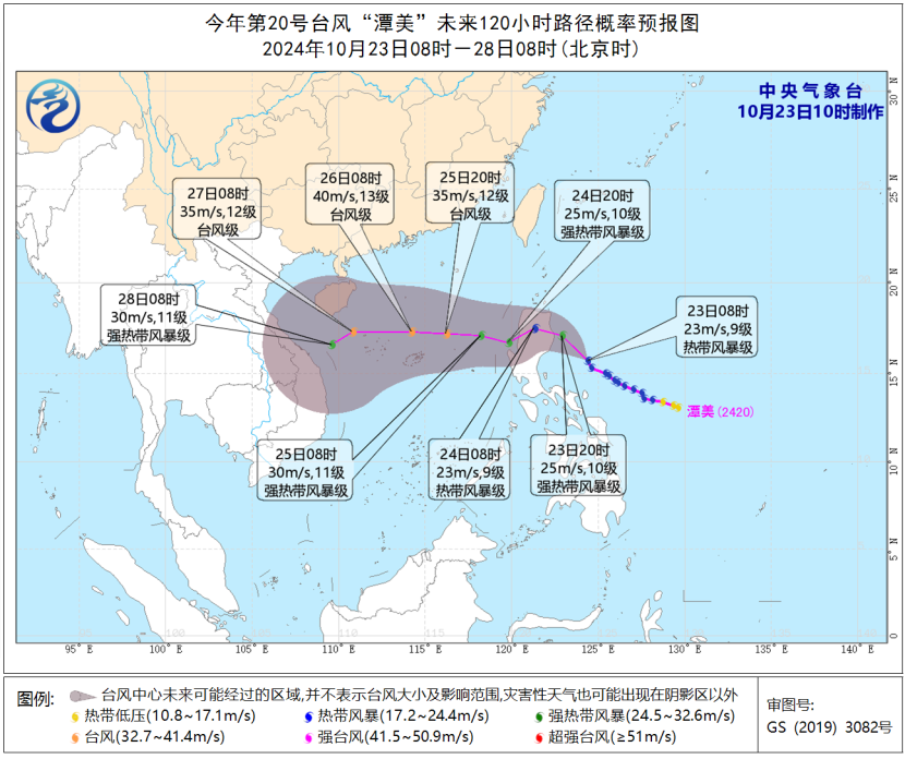 中央气象台10月23日10时继续发布台风蓝色预警。 预计,“潭美”将以每小时15至20公里的速度向西北转偏西方向移动,强度缓慢增强,并向菲律宾吕宋岛东北部沿海靠近,将于23日夜间至24日白天穿过吕宋岛北部,并于24日傍晚前后移入南海东部海面。