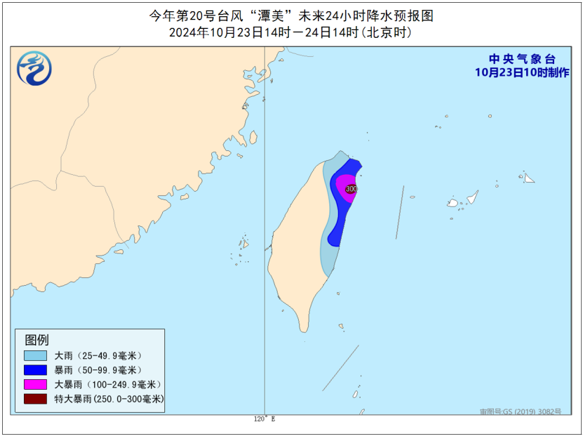 降水方面,23日14时至24日14时,台湾岛东部有大到暴雨,局地大暴雨或特大暴雨(250至300毫米)。