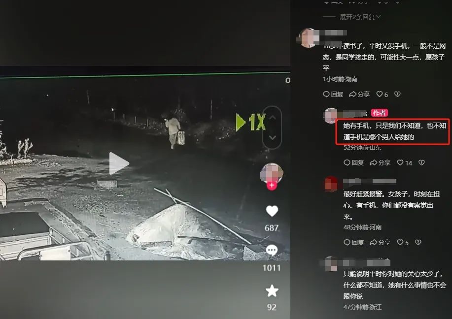 10月22日,有网友发布视频,称自己的女儿在10月22日凌晨两点半离家出走,至今未归。针对网友的评论,视频发布者称:“她有手机,只是我们不知道,也不知道手机是哪个男人给她的。”
