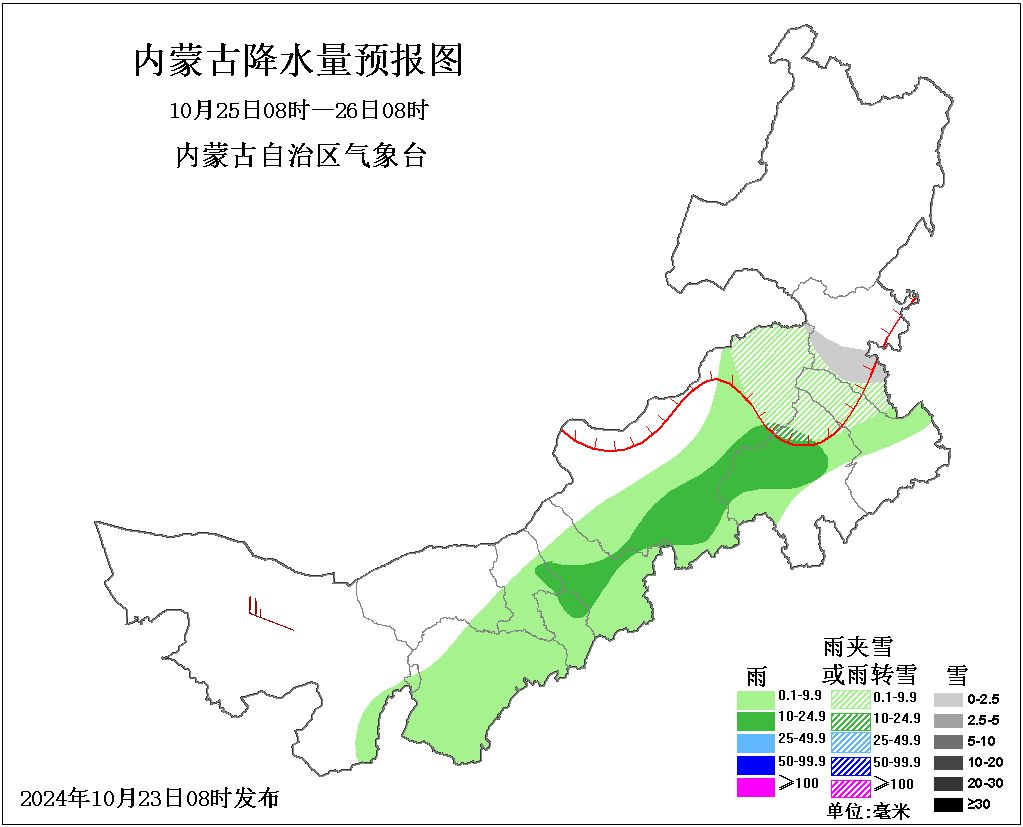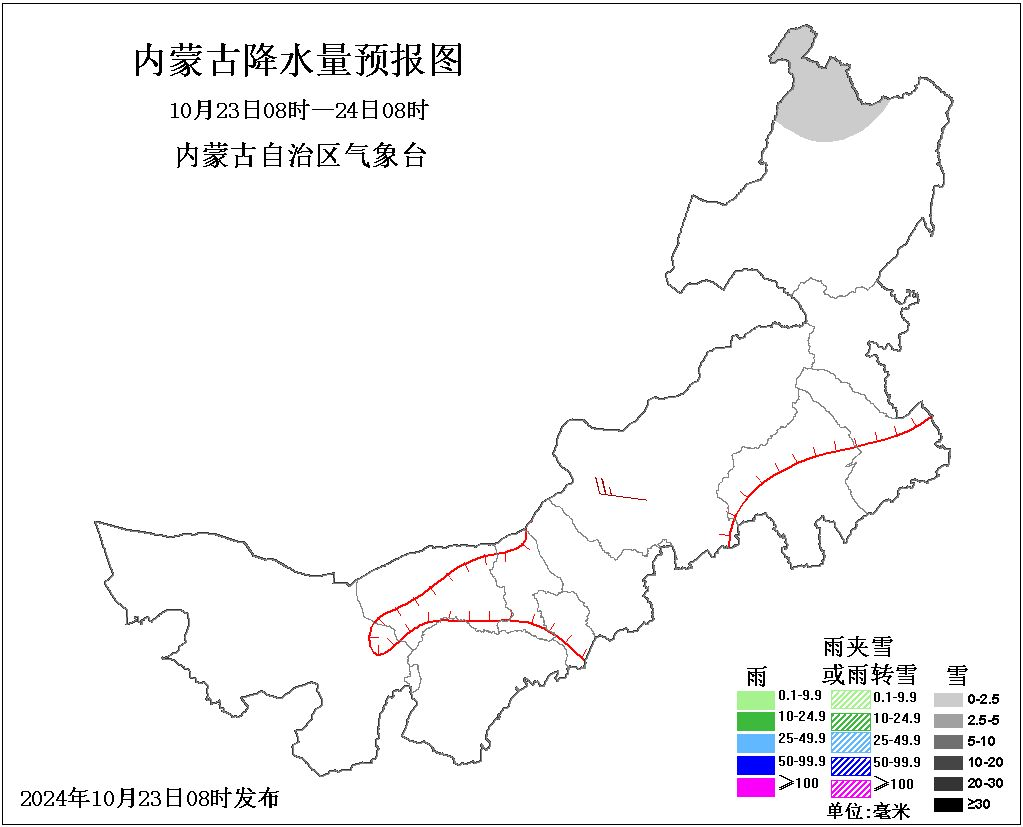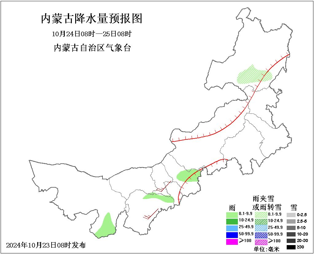 今明两天,内蒙古大部地区晴间多云,东北部有小雨、雨夹雪或小雪,中西部有分散性小雨或雨夹雪。后天弱冷空气来临,我区中西部偏南和东部大部地区多云,有小雨、雨夹雪或小雪,部分地区有中雨或雨夹雪,其余地区晴间多云,同时,西部偏东、中部偏西和东南部部分地区气温下降4~6℃。未来三天,内蒙古中西部大部有4、5级短时6、7级风,西部偏西地区局部伴有沙尘天气。深秋时节,寒意明显,注意备好衣物,防范疾病发生,同时,雨天路滑,公众出行注意道路安全。