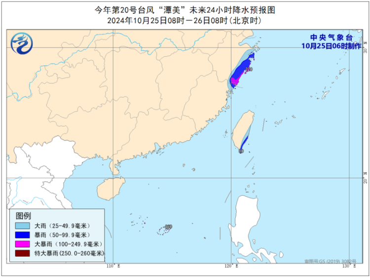 降水预报:25日08时至26日08时,浙江东部、福建东北部、台湾岛东部、西沙群岛、中沙群岛等地有大雨,其中,浙江沿海地区、福建东北部、台湾岛东部、西沙群岛、中沙群岛等地部分地区有暴雨或大暴雨,局地特大暴雨(250至260毫米)。