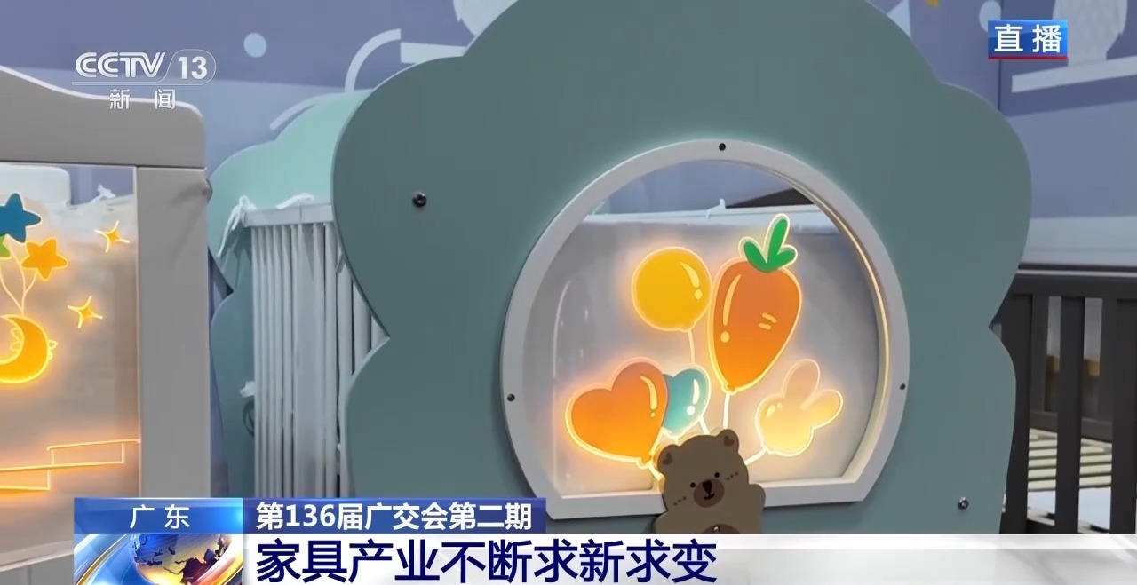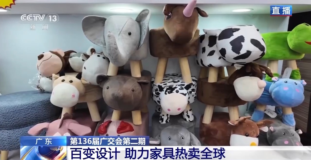 总台记者现场观察,广交会的家具展区不仅是人气展区,也是在设计上百花齐放的展区。有的是小清新的原木风格,将竹片、藤编等自然元素融入板材,美观实用的同时更加环保;有的则是可爱的卡通风格,采用动物造型、毛绒材质;还有的迎合时下流行的户外风。