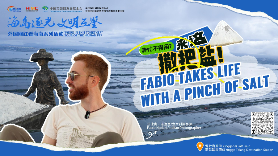 “在汉语中,休闲的’闲‘和咸盐的’咸‘读音相同。所以当你需要放松的时候,不妨来到莺歌海这个美丽的地方,给你的生活撒点盐,闲一闲。”法比奥·诺达里面对镜头,向大家发出邀请。