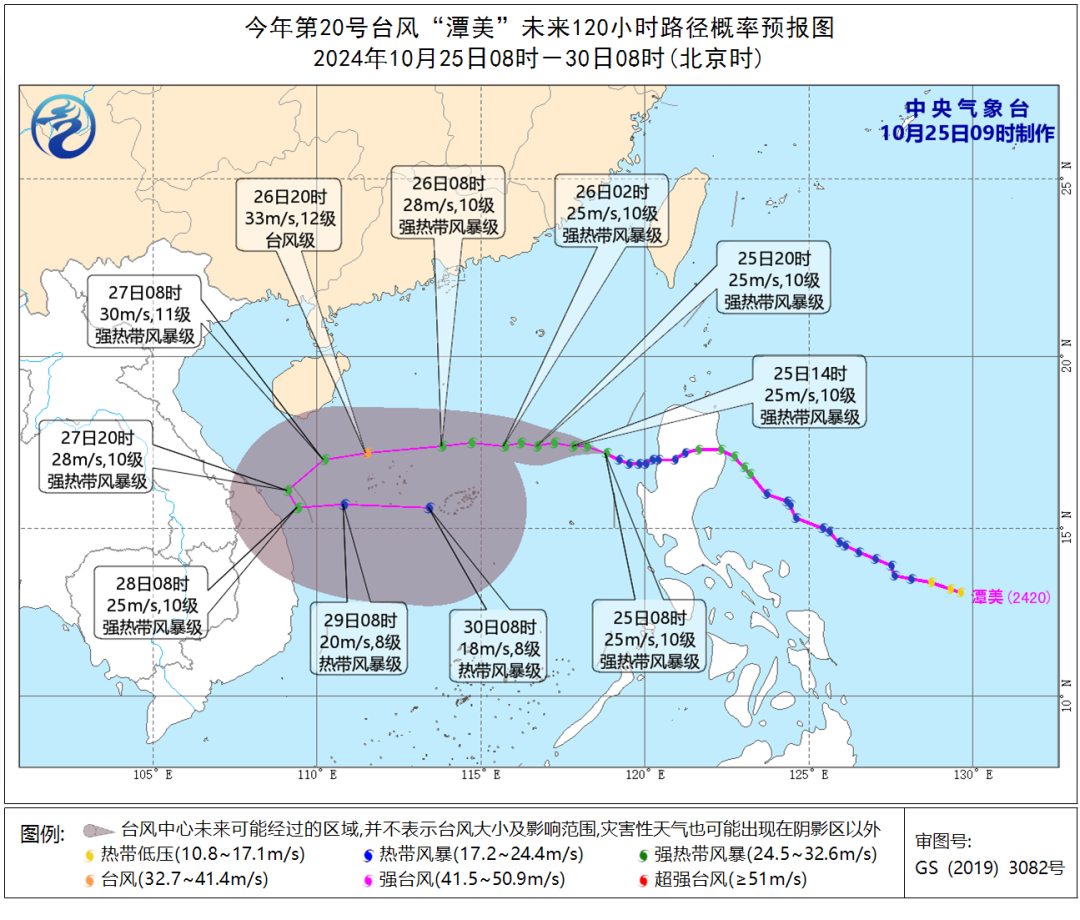今年第20号台风“潭美”(强热带风暴级)08时中心位于菲律宾吕宋岛西部近海,就是北纬17.2度、东经118.8度,中心附近最大风力有10级(25米/秒),中心最低气压为985百帕。预计,“潭美”将以每小时15-20公里的速度向偏西方向移动,强度变化不大。