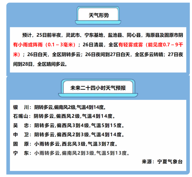 25日前半夜,灵武市、宁东基地、盐池县、同心县,海原县及固原市阴有小雨或阵雨(0.1~3毫米),其它地区阴;