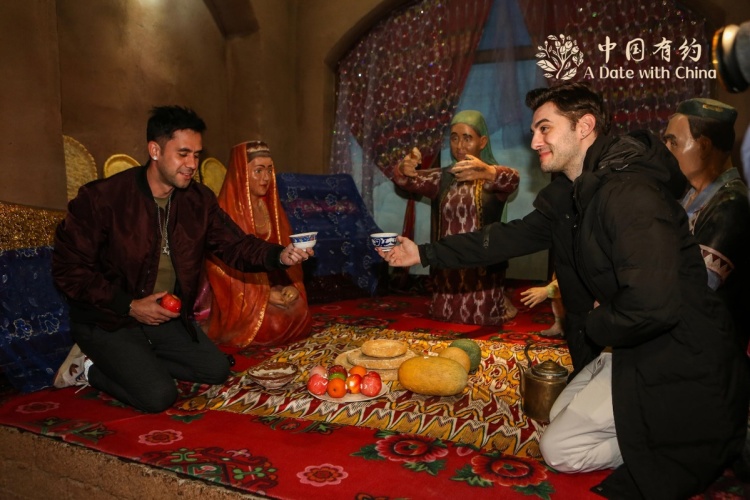 探访活动还安排了一场精彩的表演。2023年大馕城中厅进行升级改造,修建了大型演艺舞台,打造一台以古代龟兹乐舞和当下库车非遗相融合的乐舞诗剧目。外籍自媒体人们在欣赏了精彩的表演后,纷纷走上舞台与演员们一起互动,感受着千年古城人民的热情与友好。