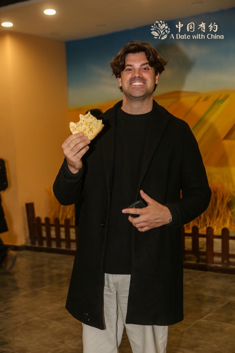在库车大馕城,中国日报加拿大籍专家Felix Bachand有幸品尝到了刚刚出炉的烤馕。这馕色泽金黄,如车轮般大小,外皮酥脆,内里松软,散发着诱人的香味。Felix Bachand在品尝后赞不绝口,并即兴为大馕“代言”,表示这是他吃过的最美味的馕之一。