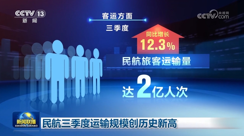 央视网消息(新闻联播):记者从中国民航局了解到,今年三季度民航全行业共完成运输总周转量403.5亿吨公里,同比增长19.8%。客货运规模创历史新高。