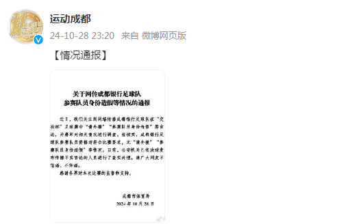 成都市体育局官方微博10月28日晚发布情况通报,全文如下: