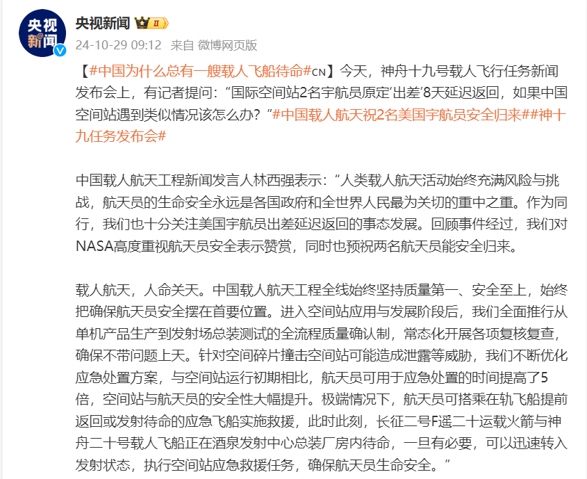 今天,神舟十九号载人飞行任务新闻发布会上,有记者提问:“国际空间站2名宇航员原定‘出差’8天延迟返回,如果中国空间站遇到类似情况该怎么办?”