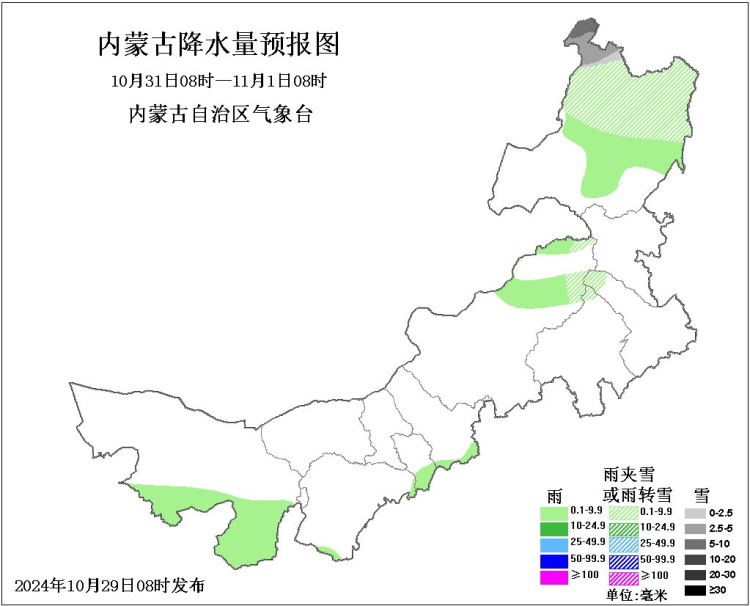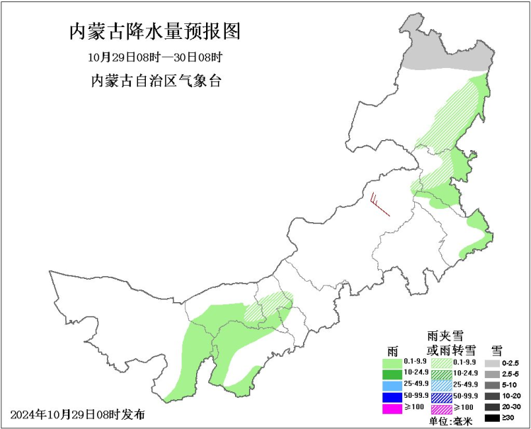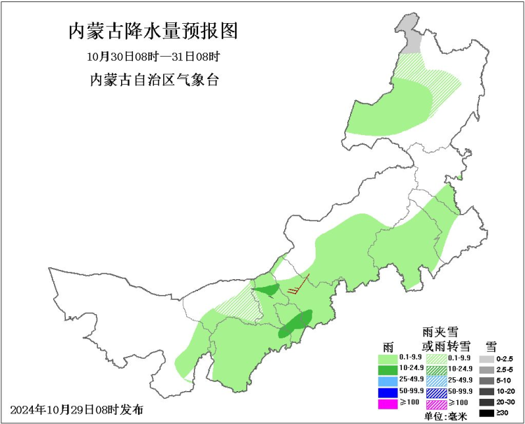 今天(10月29日),内蒙古部分地区降水来临,西部偏东、中部偏西、东部偏东地区多云,有小雨、雨夹雪或小雪。之后两天雨雪天气持续。明天降水较为集中,有小雨、雨夹雪或小雪,主要位于我区西部偏东、中东部大部地区。后天降水较为分散,在西部偏南和中东部地区有小雨、雨夹雪或小雪,部分地区有中雪,局地有大雪。已至深秋,内蒙古中部及东南部部分地区有4、5级短时6级大风,注意做好防风措施,雨雪天气道路湿滑,公众出行应注意道路及交通安全。