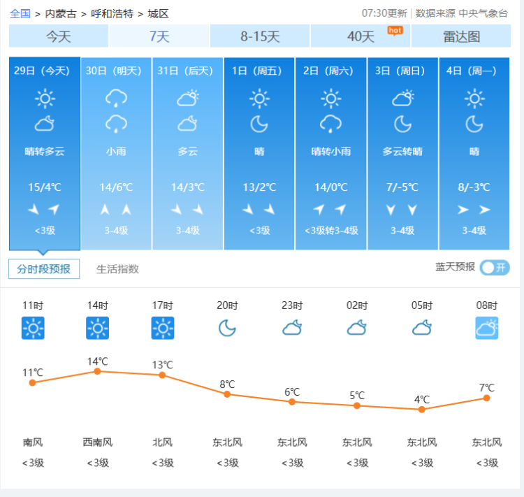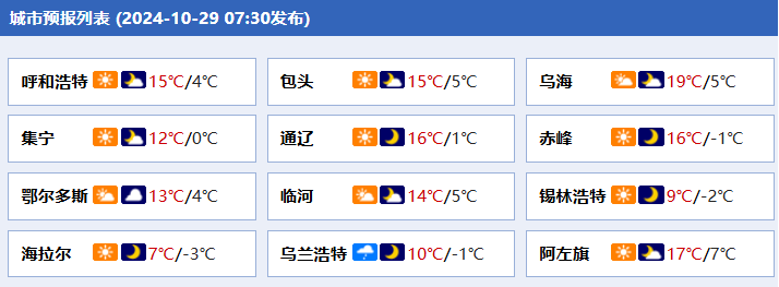 气温方面,今明两天,内蒙古气温整体较平稳,除东部部分地区外,内蒙古其余大部地区最高气温在10℃以上,处于12~15℃。后天,气温有所下降,内蒙古中部偏东、东部大部地区气温下降4~6℃,部分地区最低气温降至0℃以下,夜间冷意明显,日常出行注意防寒保暖。