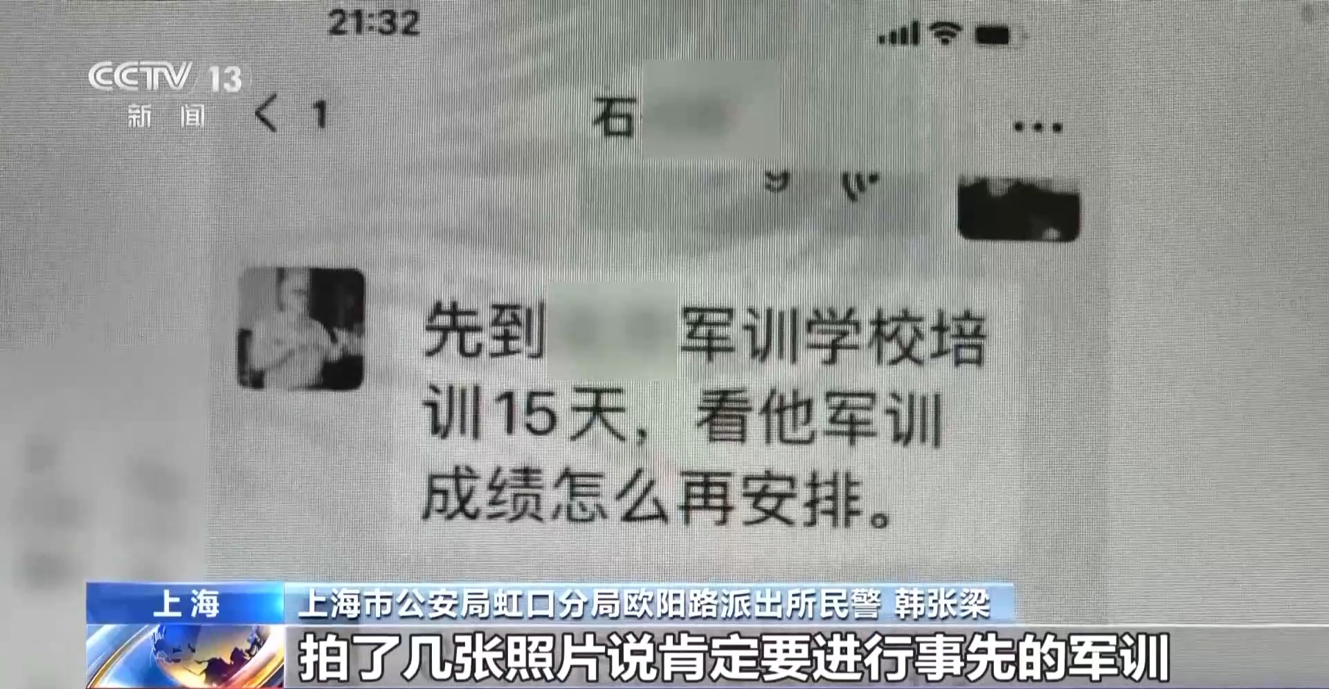 上海市公安局虹口分局欧阳路派出所民警 韩张梁:还自己在外面找了一家类似于军训夏令营的地方,拍了几张照片说要进行事先的军训,有相应的资质才可以入学。
