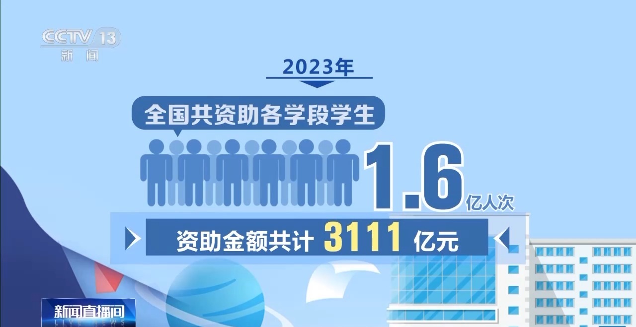 数据显示,2023年,全国共资助各学段学生1.6亿人次,资助金额共计3111亿元。其中,全国财政投入2161亿元,约占资助总金额的69%。