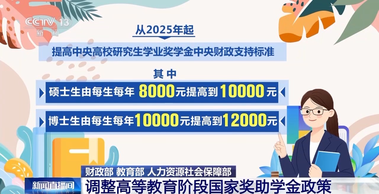 与此同时,提高研究生学业奖学金支持标准。从2025年起,提高中央高校研究生学业奖学金中央财政支持标准,其中: