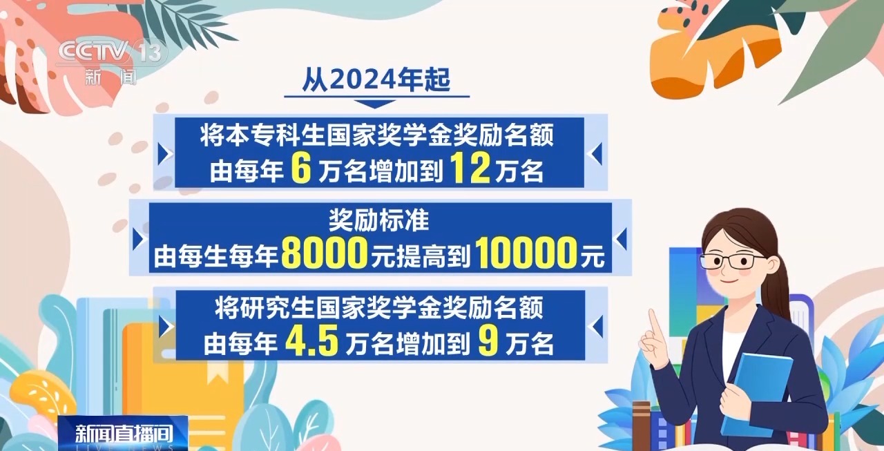 根据通知,增加高等教育阶段国家奖学金名额,提高奖助学金标准。从2024年起: